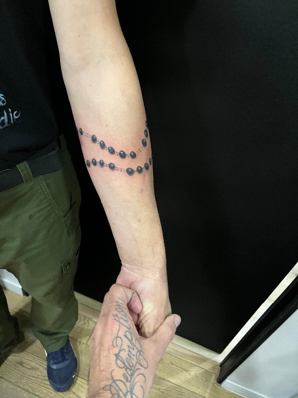 Cette œuvre unique, réalisée entièrement à la main, met en scène un terço qui s'enroule délicatement autour de l'avant-bras, créant une impression de mouvement fluide et de spiritualité. Chaque perle, chaque détail de la croix et de la chaîne a été méticuleusement tracé pour donner vie à un design raffiné et harmonieux. Un tatouage qui combine la beauté du travail artisanal avec la profondeur spirituelle, parfait pour ceux qui recherchent une œuvre significative et personnelle. Ce terço, réalisé sur mesure, est une création exclusive, symbolisant la foi et la protection, tout en mettant en valeur la silhouette de l'avant-bras.
